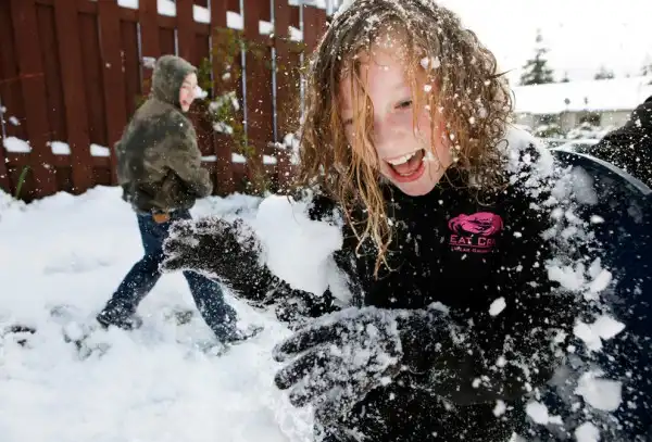Девочка по имени Иллиана играет в снежки в Кокиле, штат Орегон.