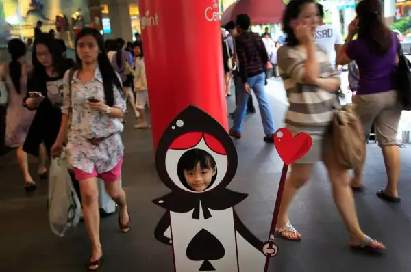 Девочка в костюме пикового валета стоит на оживленной улице в Сингапуре.