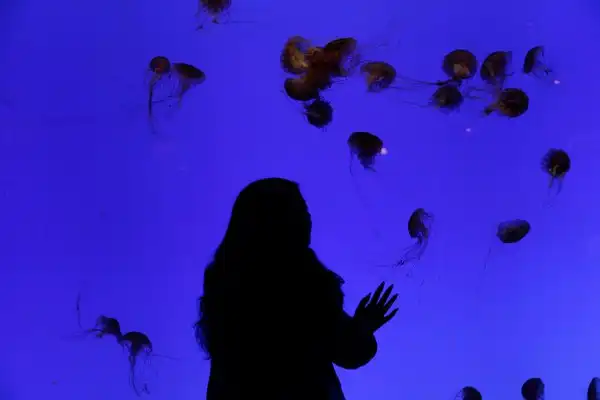 Посетительница смотрит на медуз в аквариуме в Шанхае, Китай.