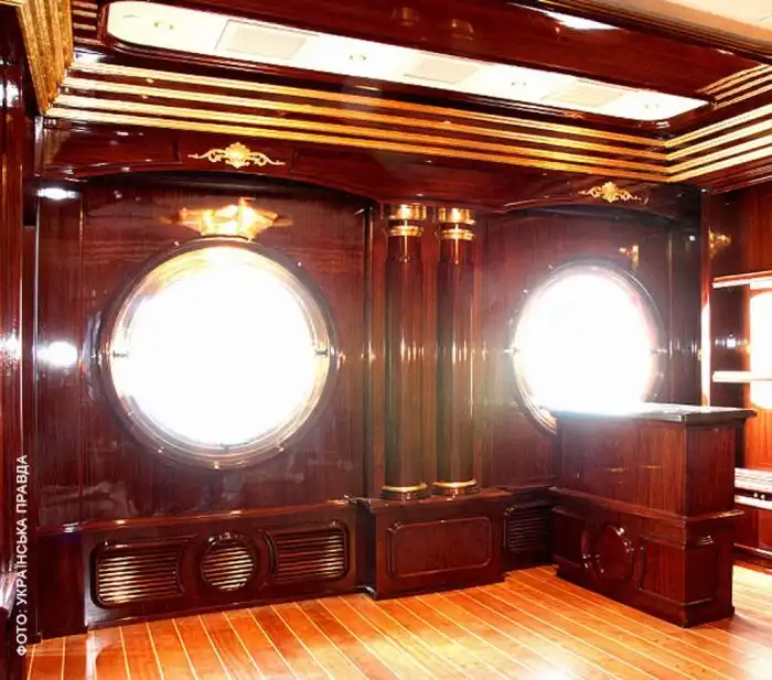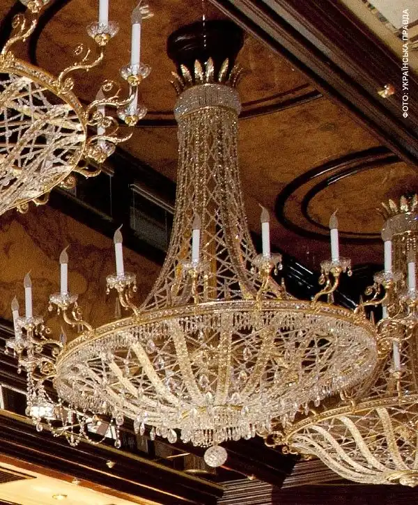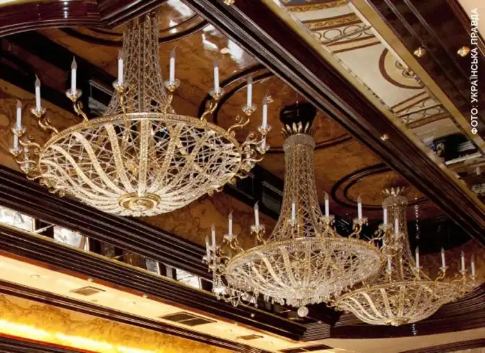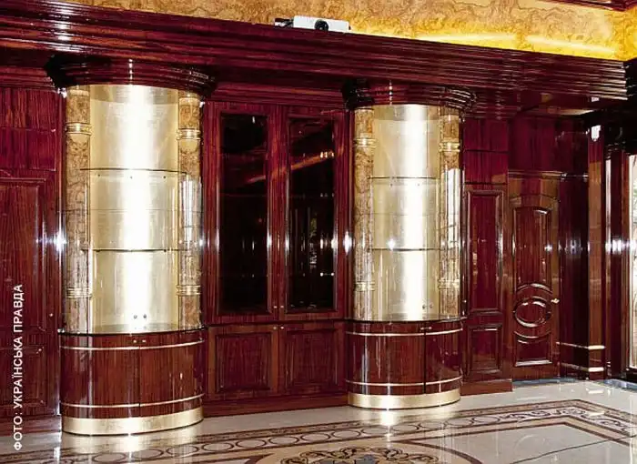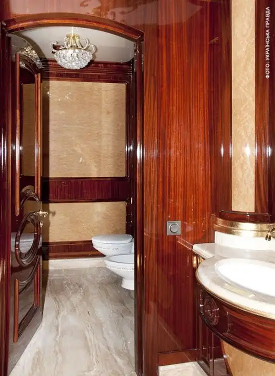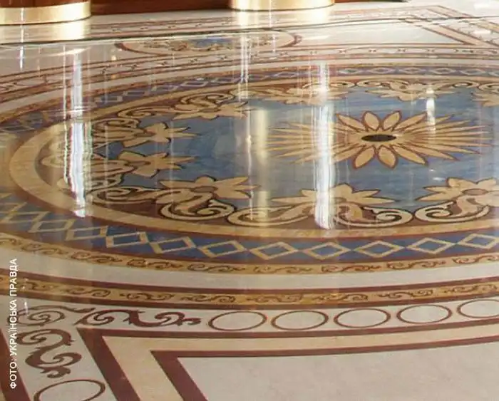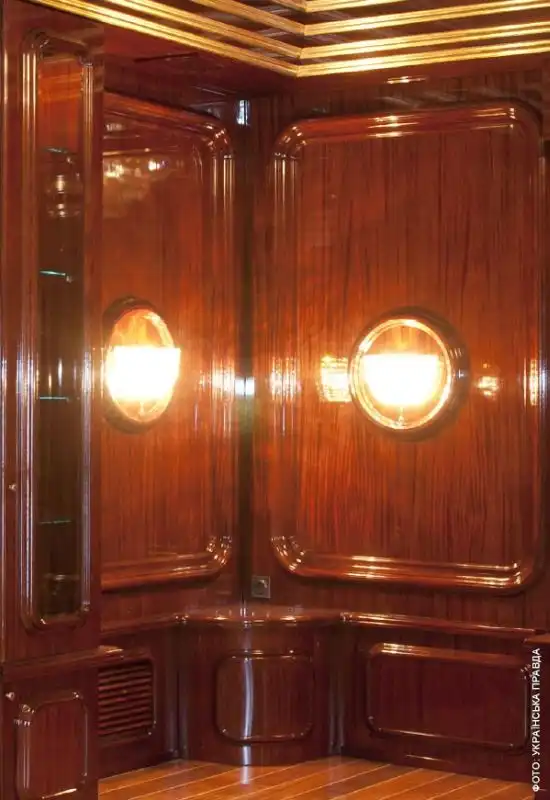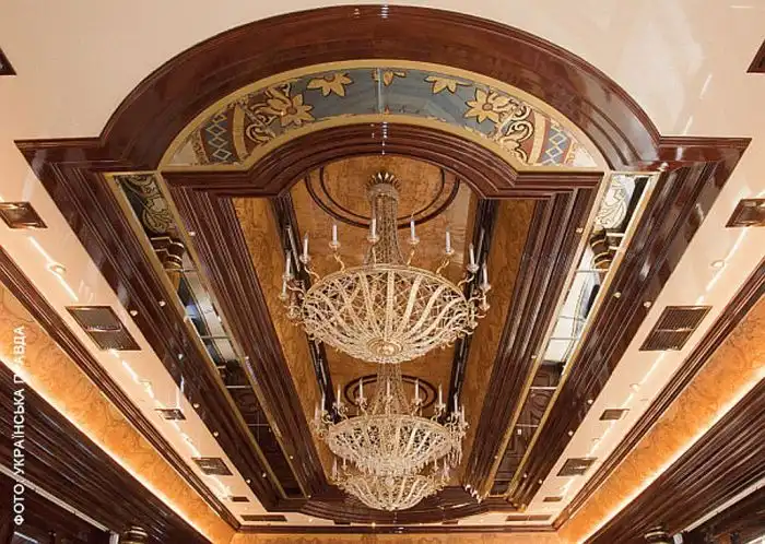 На стенах и потолке ценные породы древесины, а на полу - мрамор, всюду позолота и хрусталь.