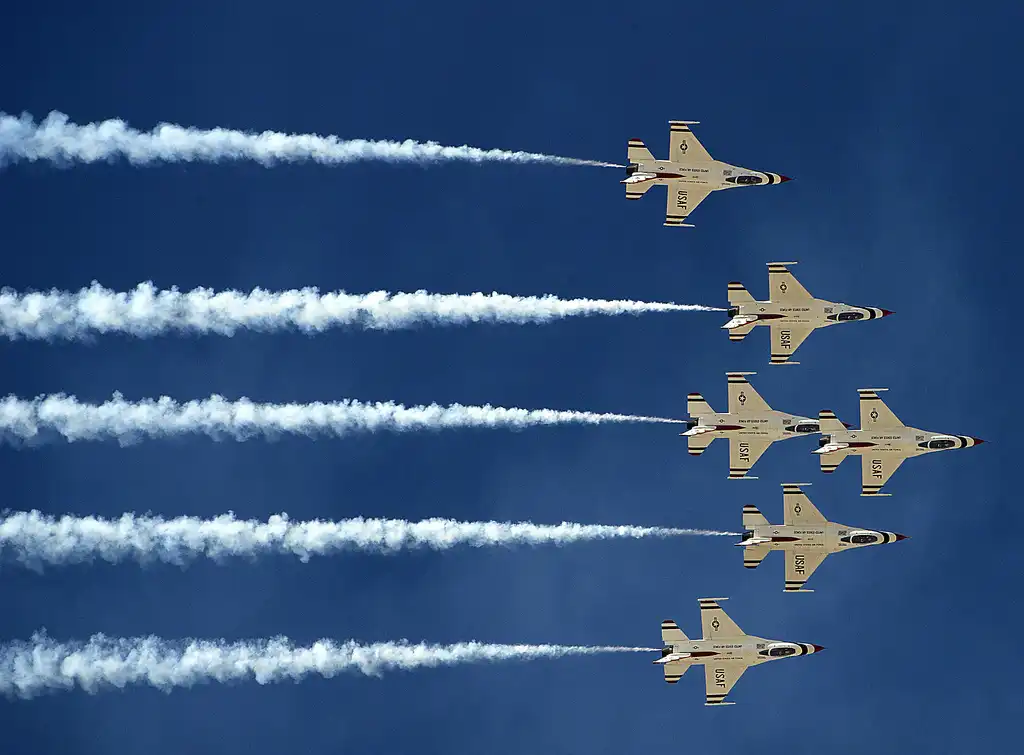 19. Пилотажная группа "Тандербердс" на F-16 выступает на авиашоу "Legacy of Liberty ", 8 октября 2011 года. (U.S. Air Force photo by Senior Airman DeAndre Curtiss)