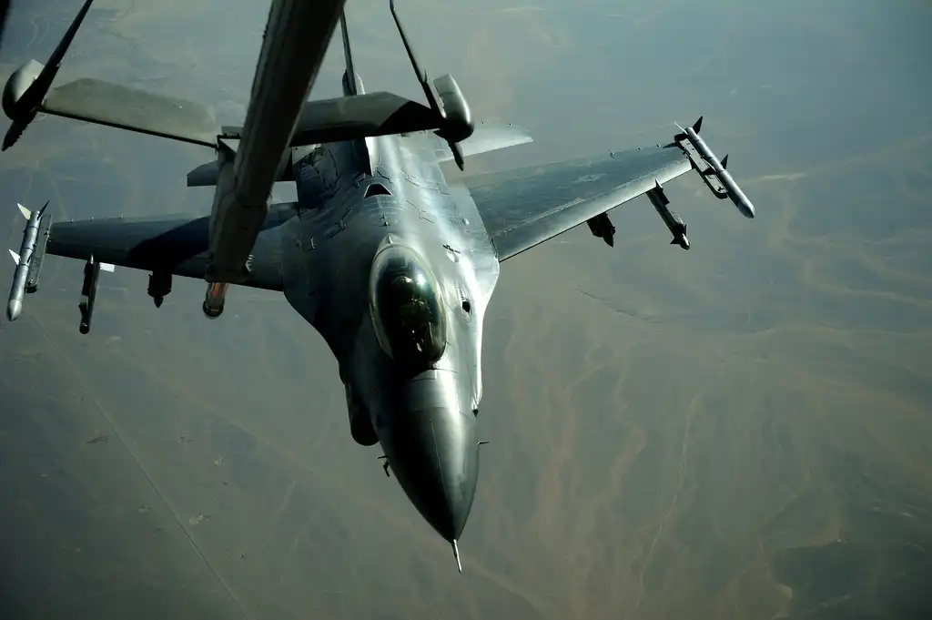 9. Истребитель F-16 "Файтинг Фолкон" из 4-й истребительной эскадрильи дозаправляется над Иорданом, 17 октября 2011 года. Каждый год страны, на вооружении которых состоит F-16, участвуют в соревнованиях "Eager Tiger Falcon Air Meet". (U.S. Air Force photo by Senior Airman Asha Kin)