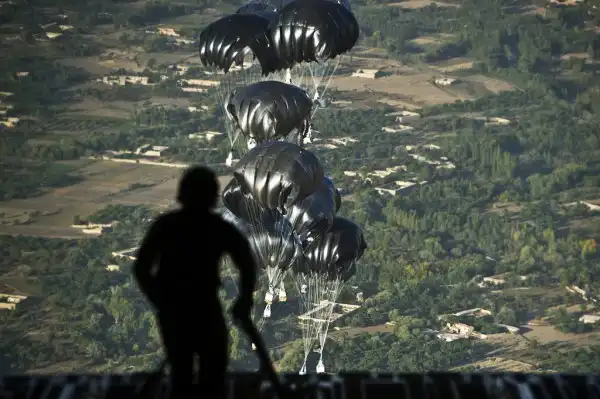 4. Боец 920-го спасательного авиакрыла базы Патрик, Флорида, совершает прыжок с борта заправщика HC-130P/N, 4 ноября 2011 года. Спасательные команды предназначены для подбора и эвакуации пилотов в самых отдаленных уголках планеты по воздуху, воде или земле. (Courtesy photo by Mike Brown)
