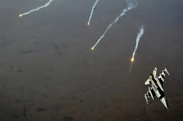 21. Истребитель F-16 "Файтинг Фолкон" выполняет маневр уклонения и сбрасывает ложные цели над Ираком, 9 ноября 2011 года. (U.S. Air Force photo by Master Sgt. Cecilio Ricardo)