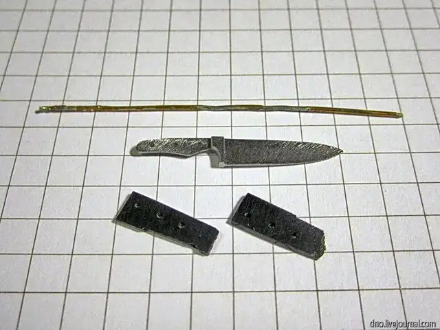 Данный экземпляр в масштабе 1 к 12 выполнен из полоски нержавейки толщиной 1.5 мм. Накладки сделаны из твёрдой пластмассы, а заклёпки – из алюминиевой проволоки диаметром 0.6 мм.