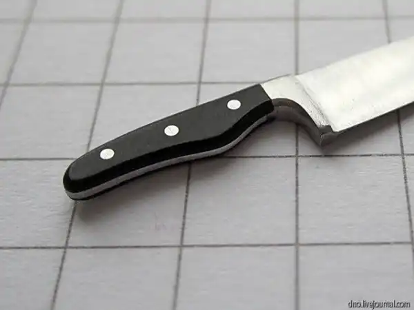 При креплении рукоятки к ножу клей я не использовал – три заклёпки держат пластмассовые накладки достаточно прочно. В конце концов, на кукольной кухне ножу с такой рукояткой сносу нет, если что!