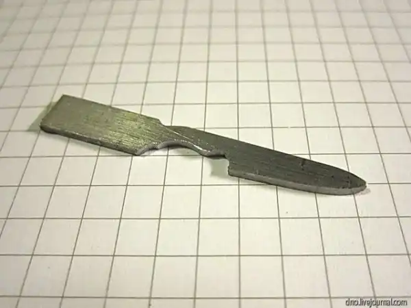 Действующую модель ножа в миниатюре можно изготовить разными способами. В данном случае применена проверенная схема, широко применяемая в тяжёлом, среднем и лёгком машиностроении – берётся заготовка и напильником стачивается всё лишнее.