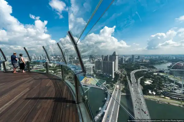 Сегодня я расскажу вам про самый крутой отель на свете, Marina Bay Sands в Сингапуре. На трех башнях высотой в 200 метров (55 этажей) располагается огромная терраса в виде гондолы с бассейнами и зелеными садами общей площадью 12,4 тыс. кв. метров. Главный бассейн, расположенный под открытым небом, не имеет видимых бортиков, из за чего создается впечатление, что кромка воды обрывается на высоте. Бассейн тянется на 150 метров и является крупнейшим бассейном, построенным на таком уровне. В отеле 2500 номеров, торговый центр, конференц-зал, 2 театра, один музей и несколько ресторанов. Постройка отеля обошлась инвесторам в 8 миллиардов долларов. Это самый дорогой отдельностоящий курорт в мире.