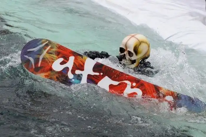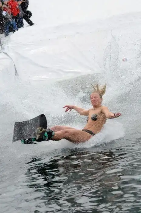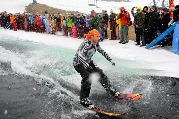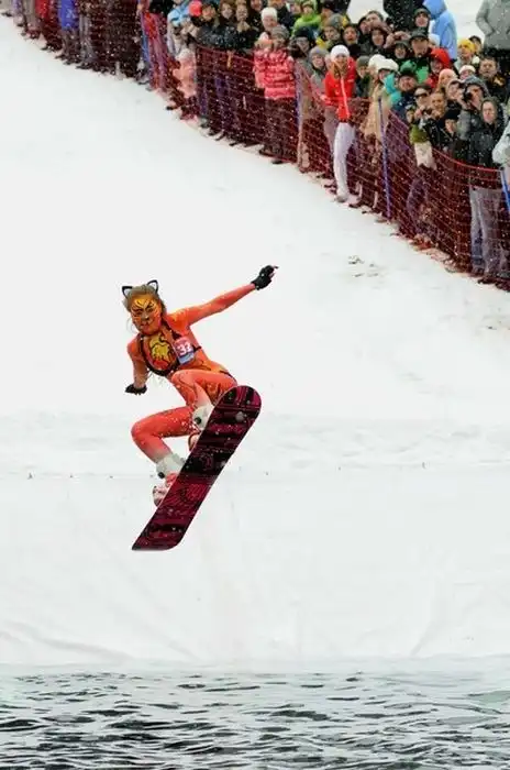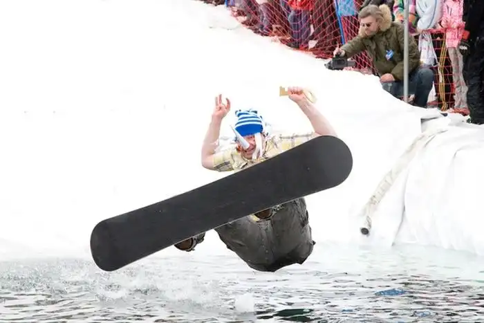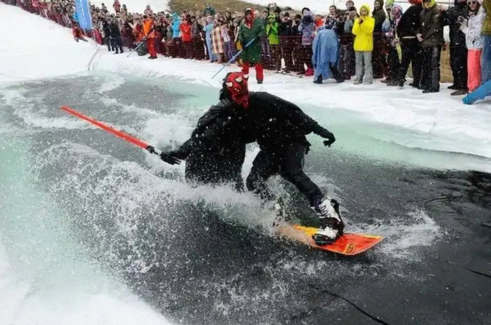 В одном из парков люди на сноубордах скатывались с горы прямо в бассейн,