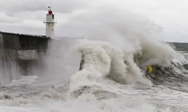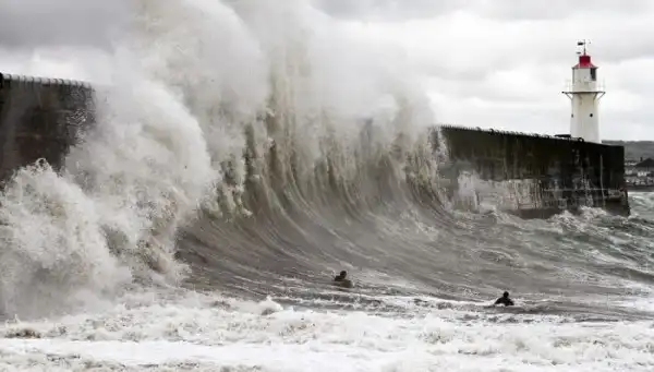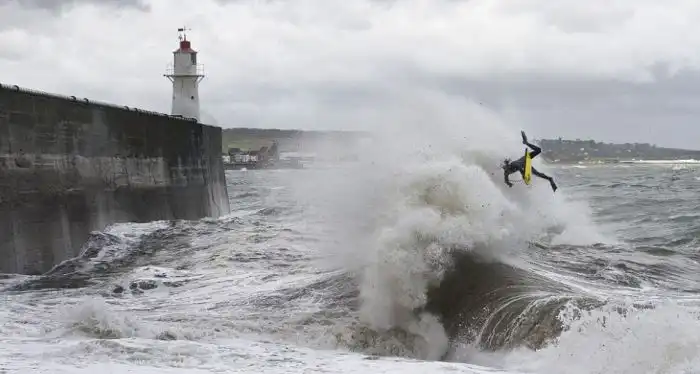 "Адреналиновые наркоманы" нереально рискуют, катаясь на серфе на южном побережье Корнуолла,где вода своими могучими волнами бьется о большую стену.