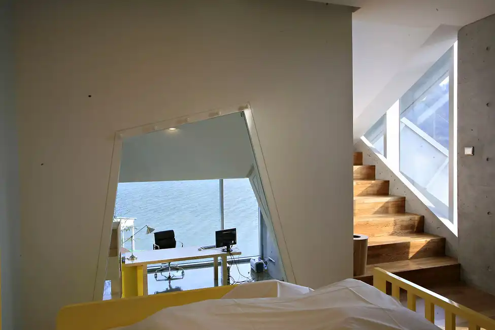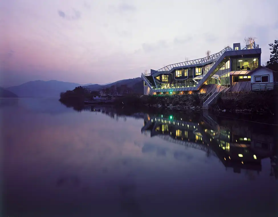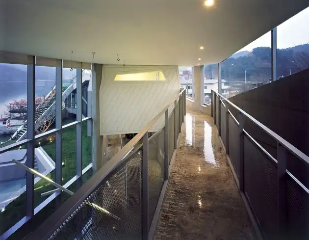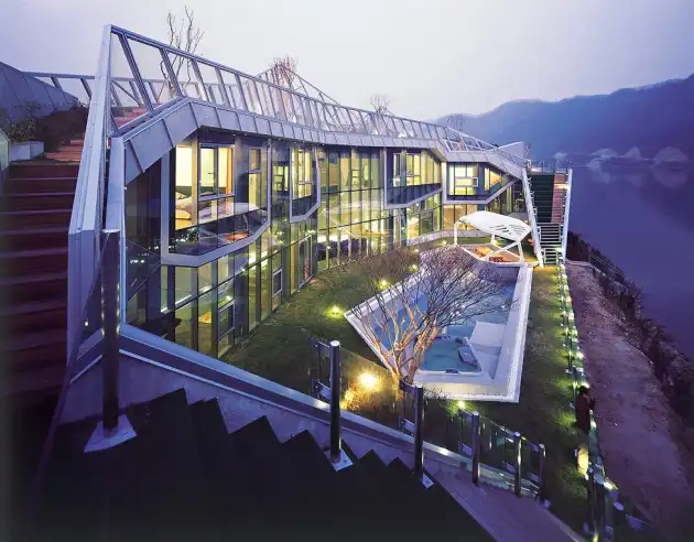 Студия дизайна Iroje KHM Architects из Сеула представила проект Island House. Завершенный в 2008 году, особняк занимает площадь в 630 кв.м. Кажется, будто он плыл по реке и в определенный момент столкнулся с землей, навсегда закрепившись на местности.