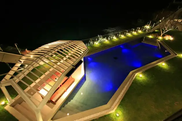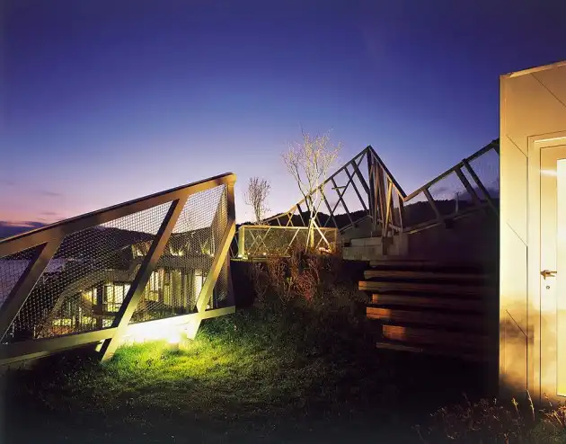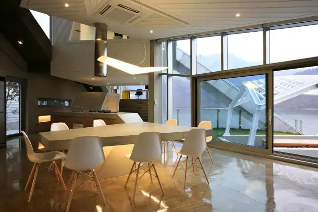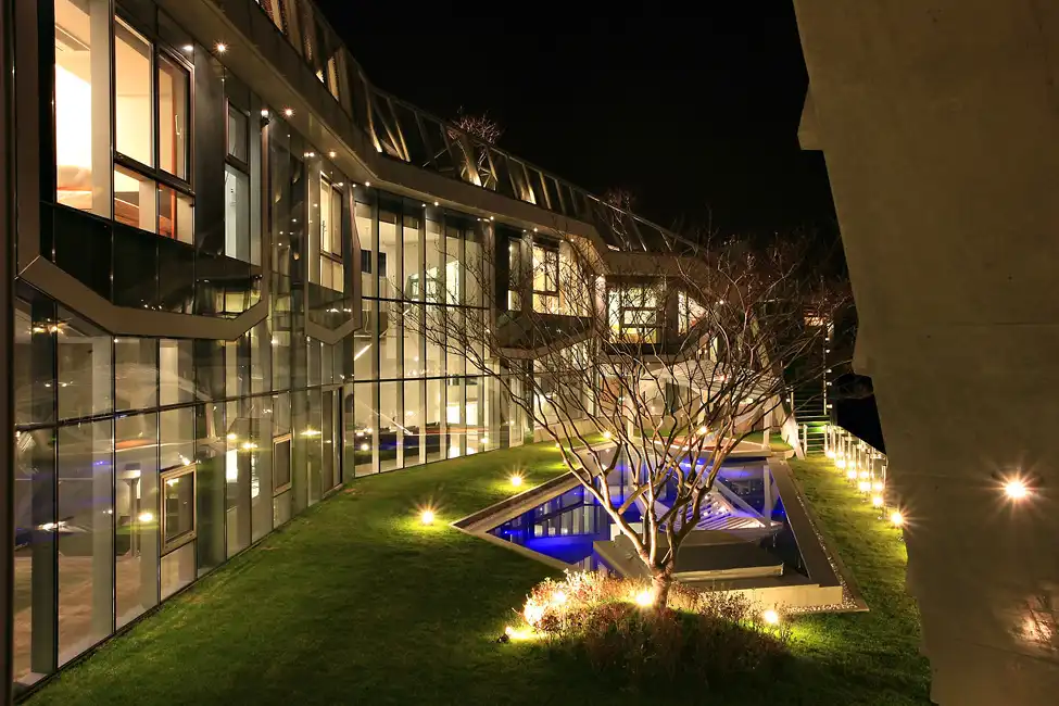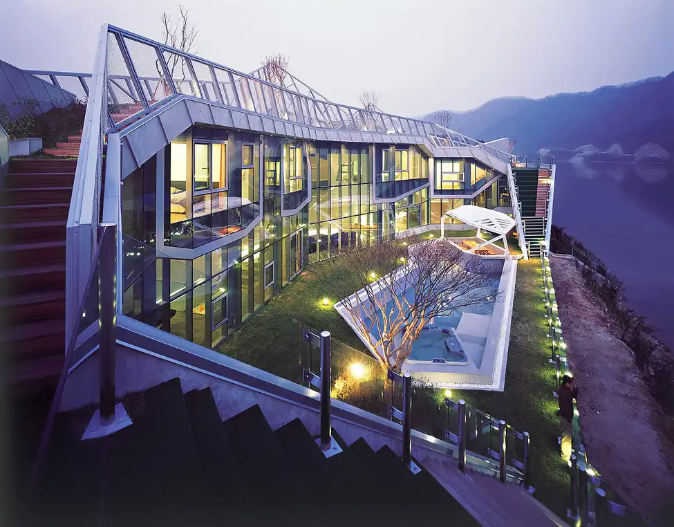 Современная архитектура максимально интегрирована в окружающий ландшафт — дизайнерами спроектирован просторный внутренний двор с бассейном, окруженным пышной растительностью, цветами и фруктами, а также зеленый сад на крыше. Из каждой комнаты открывается шикарный вид на красоту вокруг, панорамные окна усиливают эффект. В доме нет четкого разделения на этажи, динамичность и асимметрия доминируют в проекте. А сделано это, чтобы максимально напоминать гору и отлично вписаться в ландшафт.