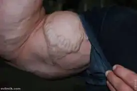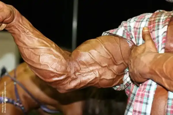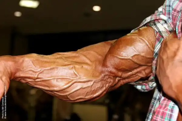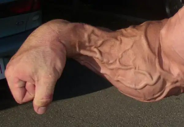 Это как бы обычная рука накаченного мужика, не обвисло там ничего, вены только торчат.
