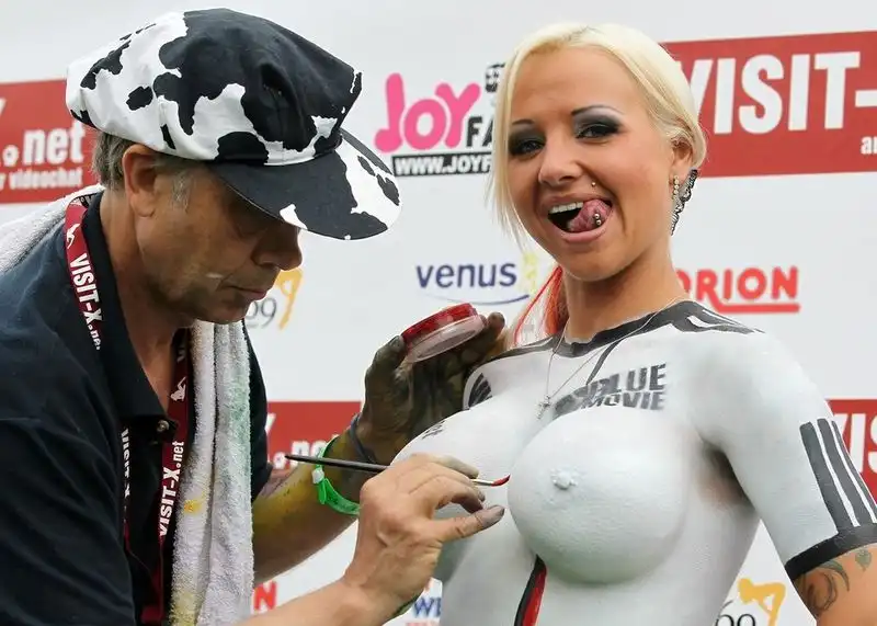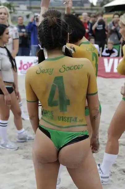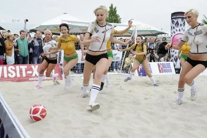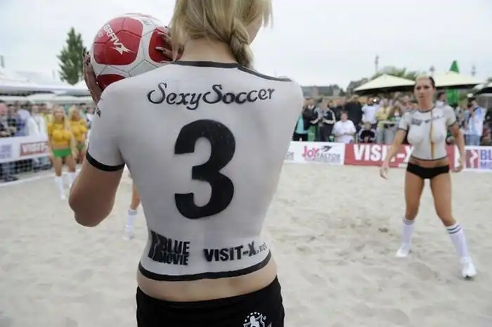 на поле вышли обнаженные девушки из команд Visit-X Camgirls и Blue Movie All Stars, раскрашенные в цвета футбольных сборных Германии и Австралии, соответственно.