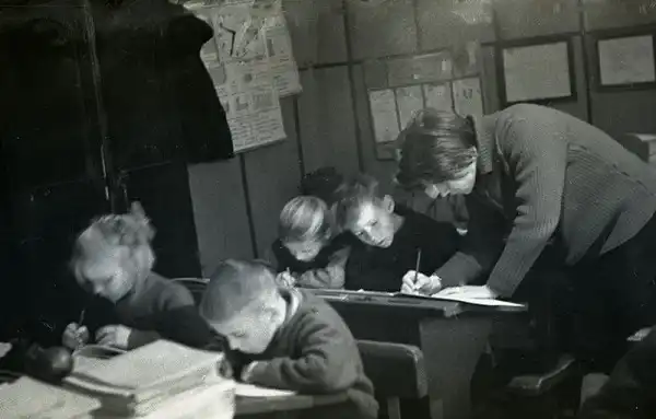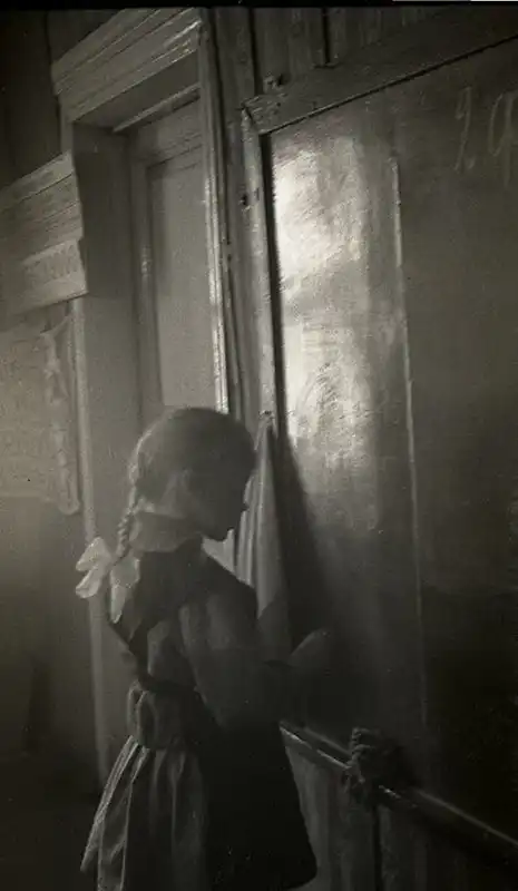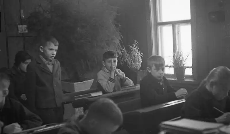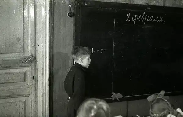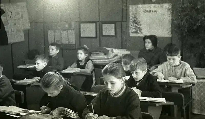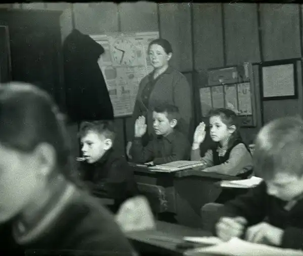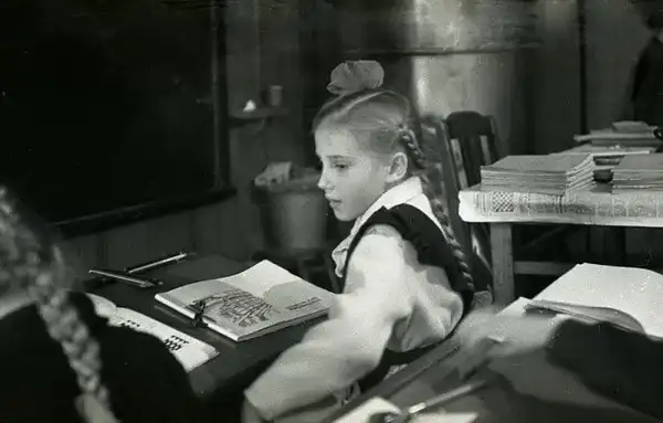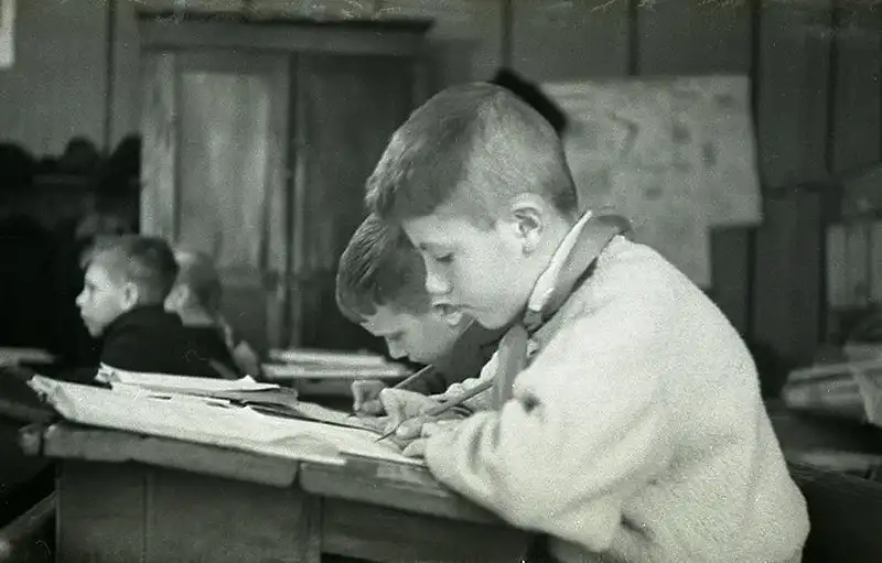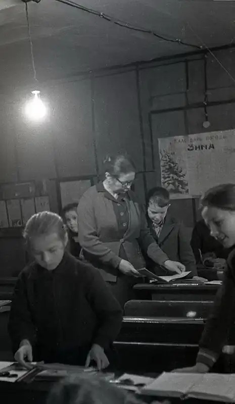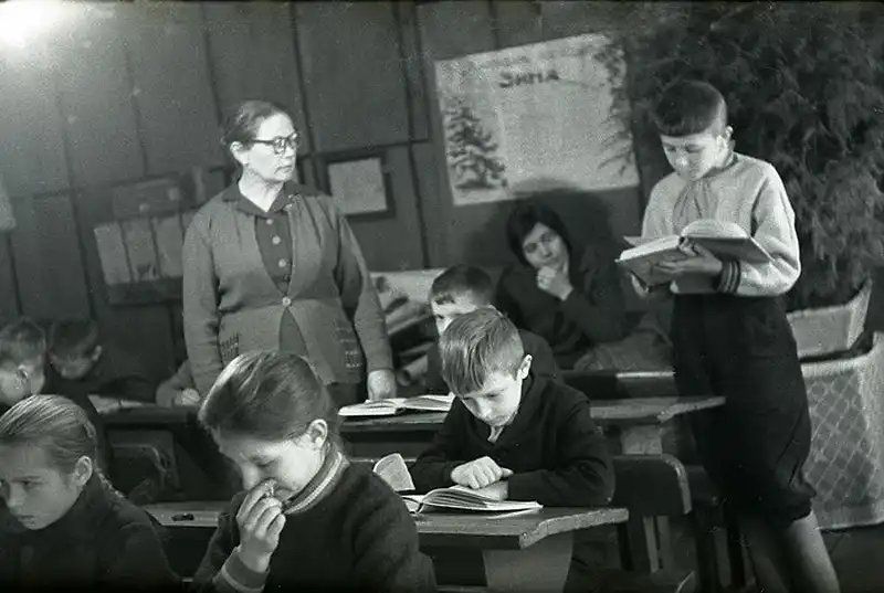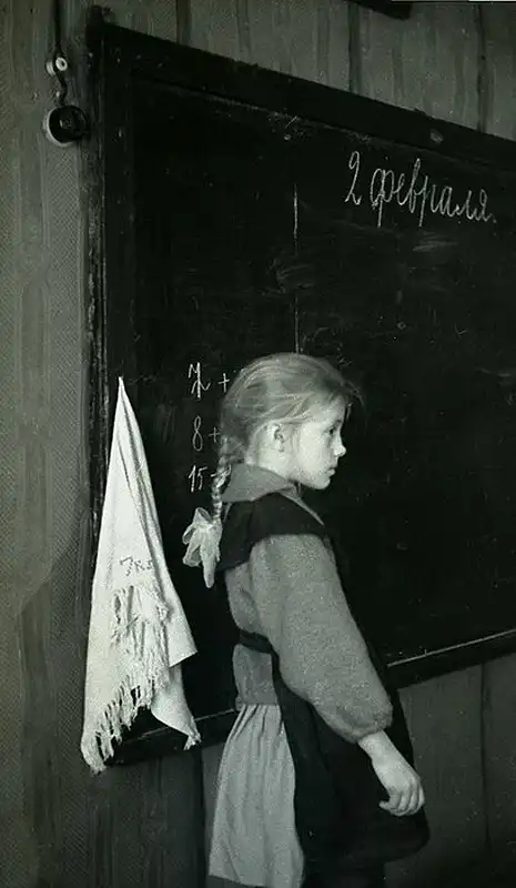 Урок в начальной сельской школе 1964 года. “Ученики с первого по четвертый класс в одной комнате, – пишет автор фотографий Людмила Таболина. – Девочки с одинаковыми косичками. Круглая печка-голландка. Пальтишки и шапки на вешалке в углу…”