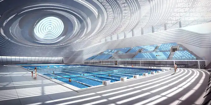Здание состоит из трех блоков, включающих в себя помещение для гимнастических состязаний, для водных видов спорта и тренировочный центр под общей крышей. Между этих блоков предусмотрено пространство для мероприятий под открытым небом.