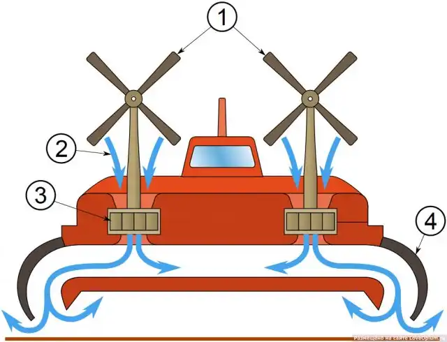 Схема работы судна на воздушной подушке: 1 — пропеллеры; 2 — поток воздуха; 3 — вентилятор; 4 — «юбка», удерживающая воздух под днищем: