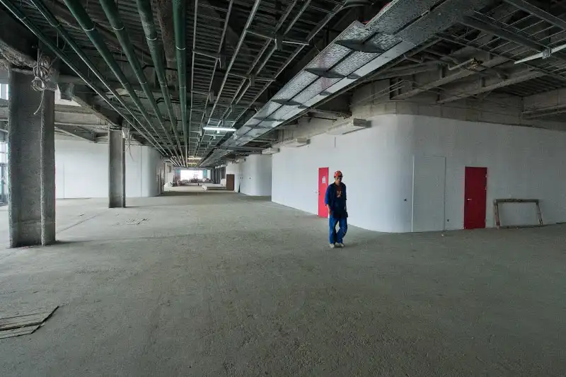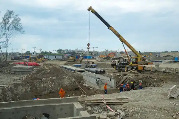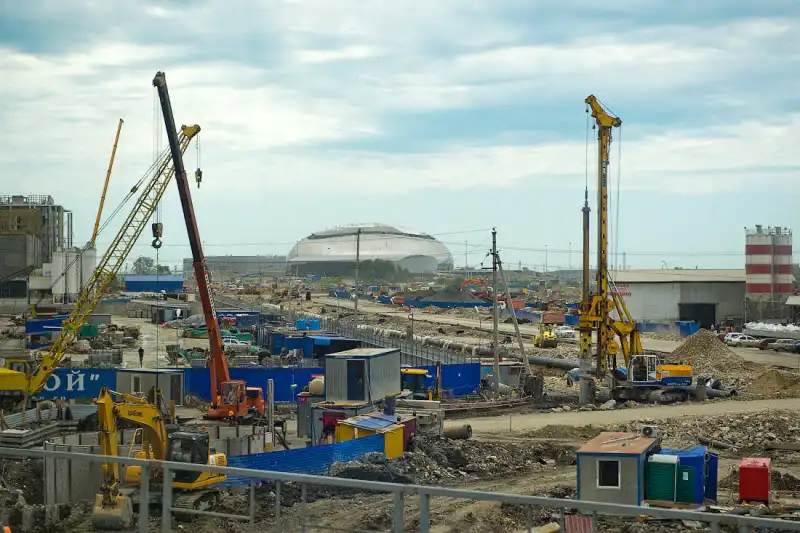 Здания на дальнем плане — это пресс-центр Олимпийских игр и гостиница для журналистов. На разбитой грунтовой дороге, которая ведет к проходной строительства, с трудом разъезжаются две машины.