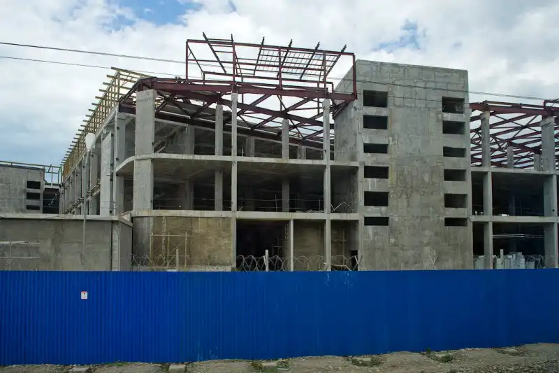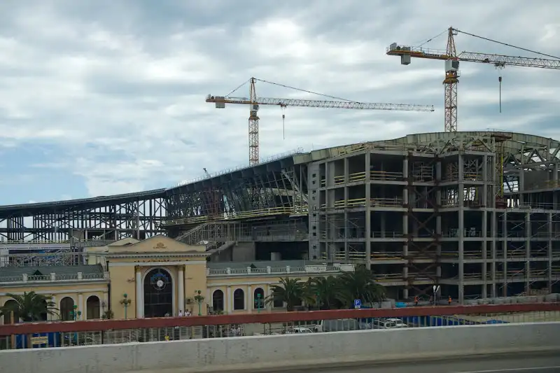 Новый вокзал в Адлере строится рядом со старым. Пока здесь только бетонный каркас и крыша. Вчера на этом вокзале РЖД показала новый электропоезд «Ласточка» (Siemens Desiro) немецкого производства — такие поезда были закуплены для перевозки гостей Олимпийских игр.