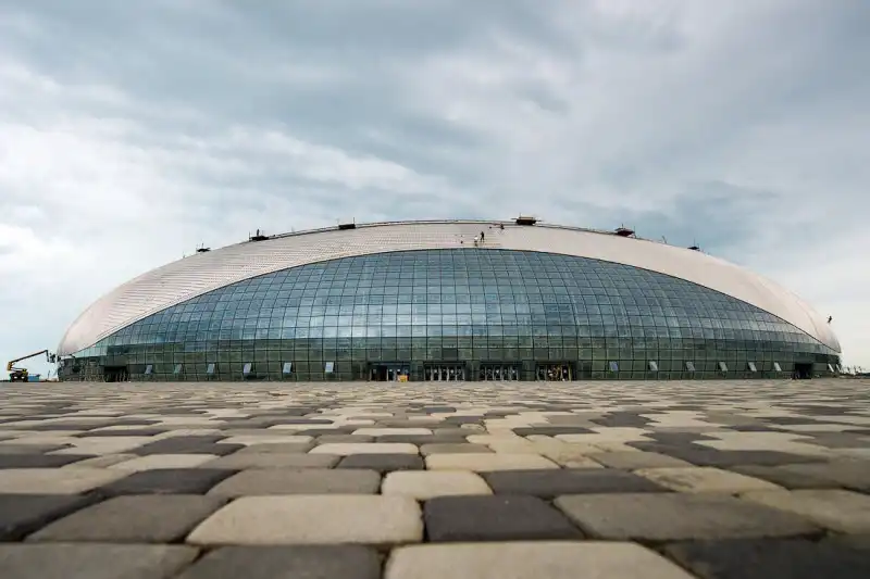 Дворец зимнего спорта «Айсберг» — два года назад здесь только начинали возводить металлический каркас сооружения. Здесь пройдут соревнования по фигурному катанию и шорт-треку.