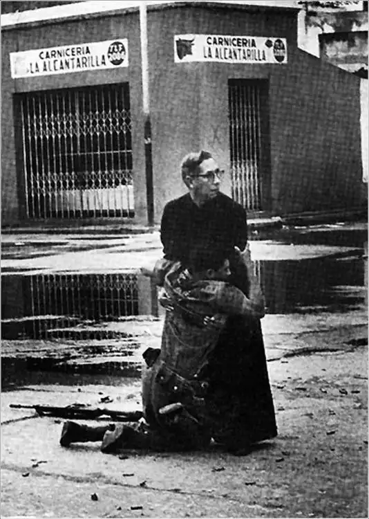 Священник Луис Падильо и солдат, раненный снайпером, во время восстания в Венесуэле.