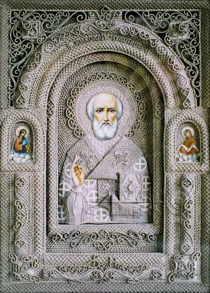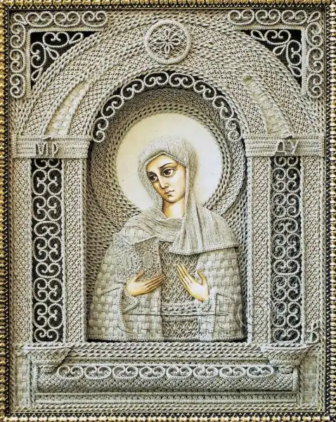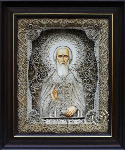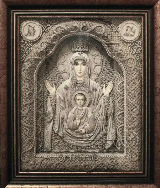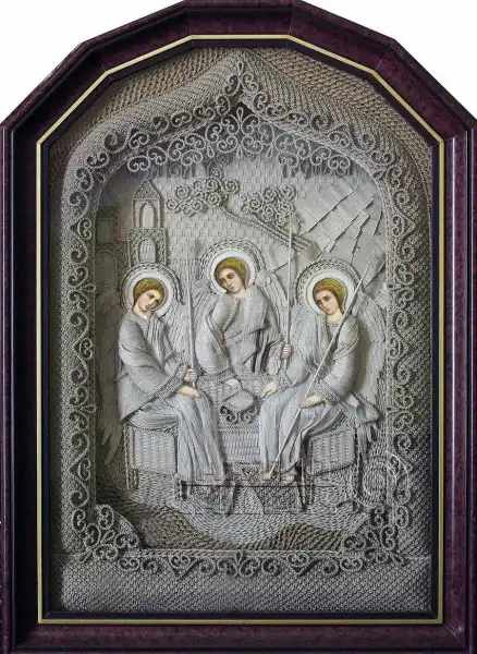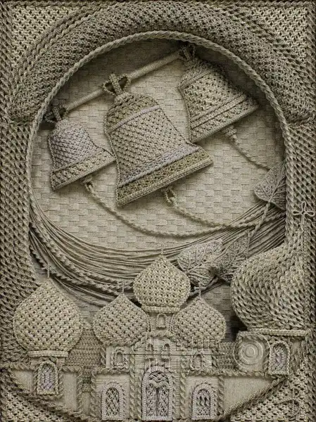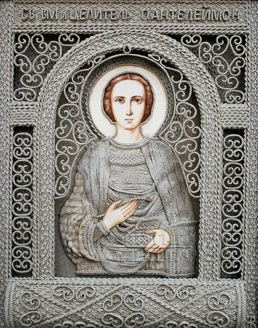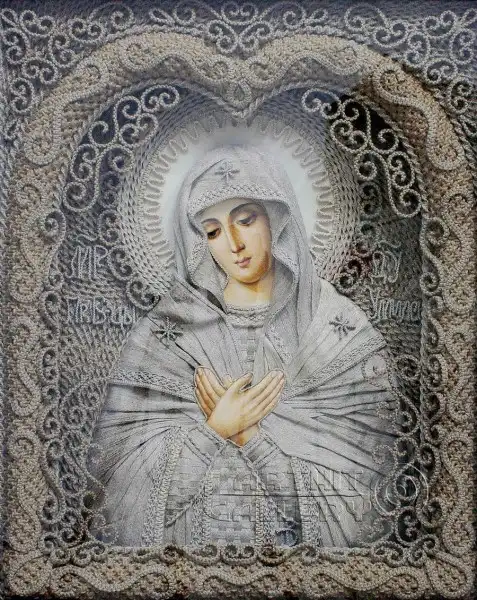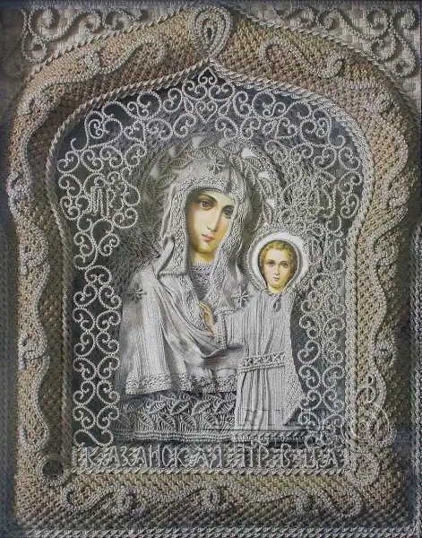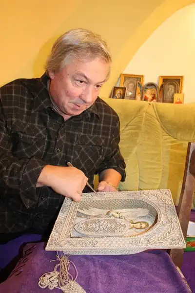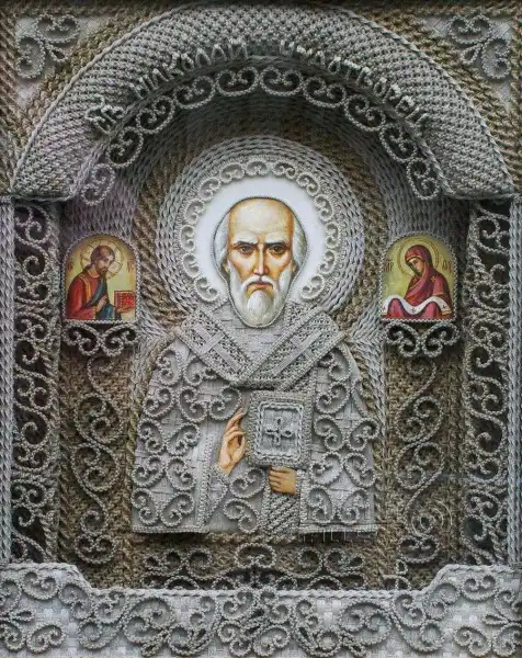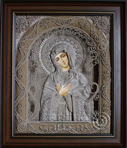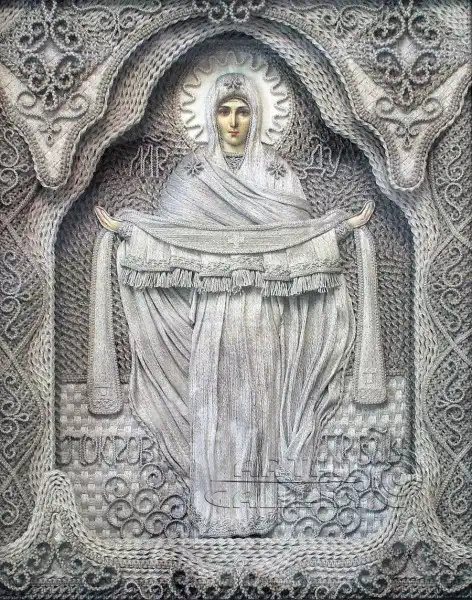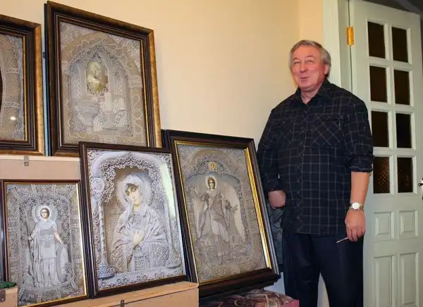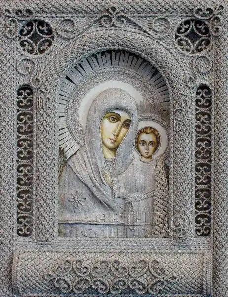 Для создания икон Владимир Анатольевич использует уникальную авторскую технику макраме-коллаж, не имеющую аналогов в мире. Лики и руки святых прописываются, а ризы и оклады выполняются из нетипичного для этого искусства материала – льняной нити толщиной 0,5-2 мм. Каждая из работ мастера насчитывает миллионы узелков, завязанных вручную, без применения каких бы то ни было технических средств.