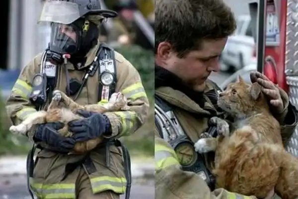 8. Пожарный только что вынес из огня котёнка и теперь приводит его в чувство при помощи кислородной маски