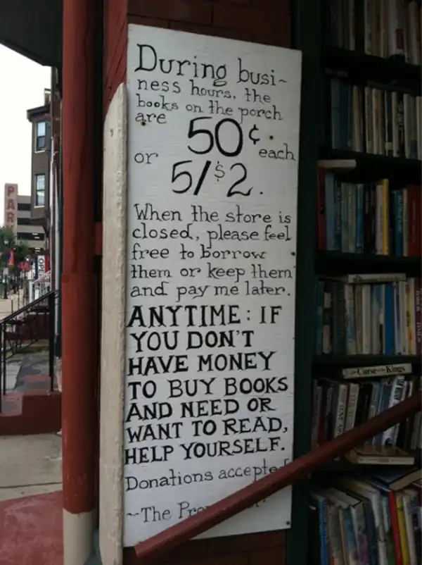 «В рабочее время любую книгу на внешнем прилавке можно купить за 50 центов, или 5 штук за 2 доллара. Когда магазин закрыт, книги всё равно можно брать и заплатить за них позже. В любое время: Если у вас нет денег, но вам нужна книга или вы просто хотите почитать – берите, не стесняйтесь. Принимаются пожертвования»