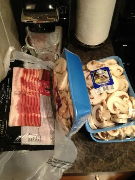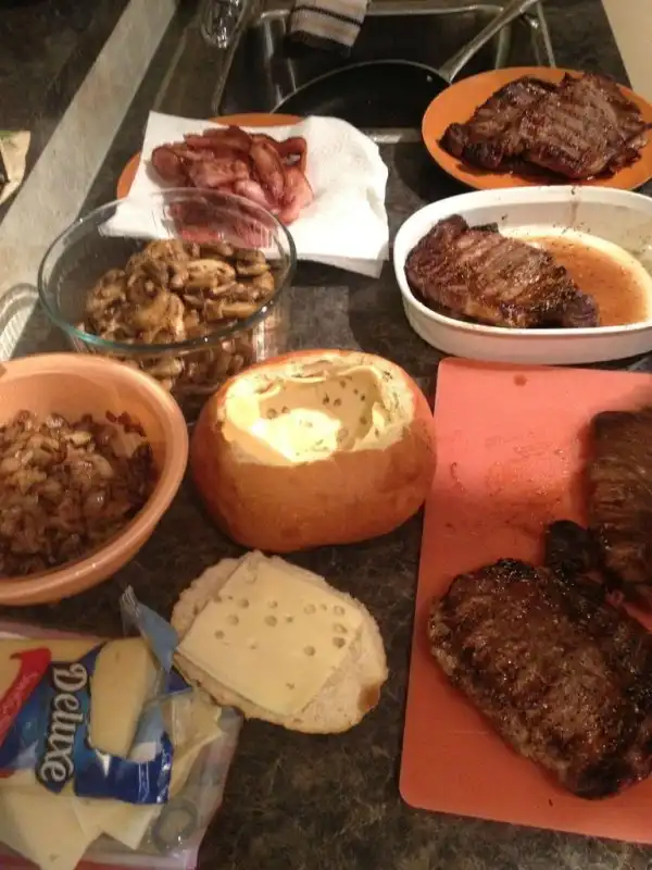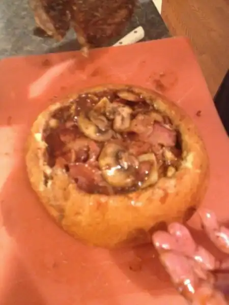 5. Пожареный бифштекс кладем на дно булки и выкладываем лук с грибами.