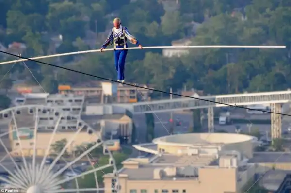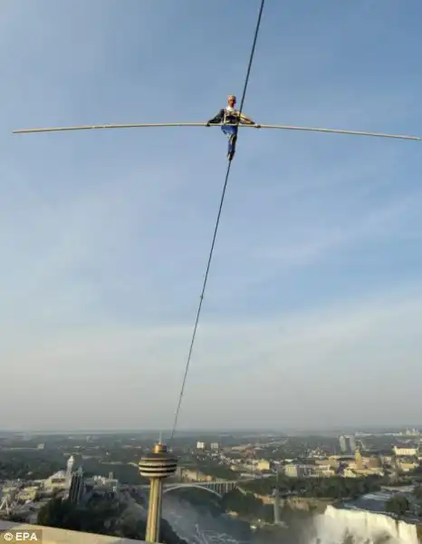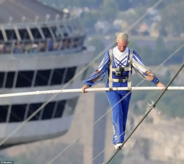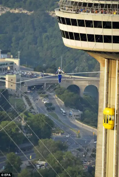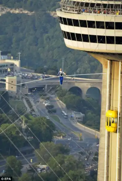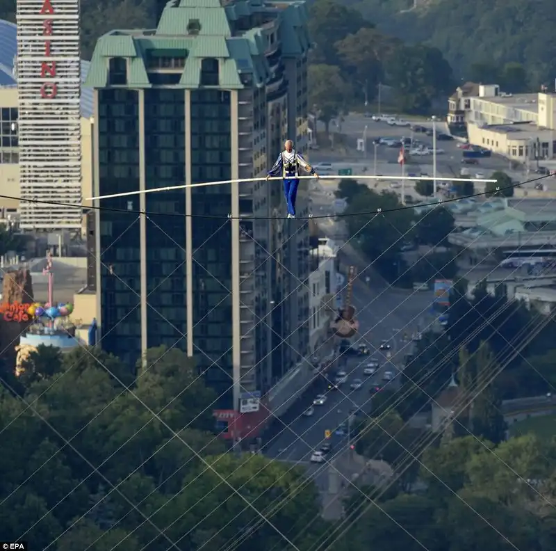 68-летний канатоходец Джей Кохрейн совершил переход с башни Skylon Tower в отель Hilton в городе Ниагара-Фолс, Канада.Трос был натянут на высоте 177 метра, его длина составляла 340 метров.Отважный дедок.