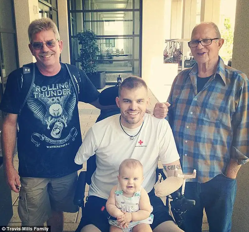1. Несчастье с 25-летним солдатом произошло в апреле этого года. Врачи были поражены его желанием жить и вернуться к полноценной жизни. На фото: Тревис Миллс с семьей, женой Келси и дочерью Хлои, в больнице после ранения.