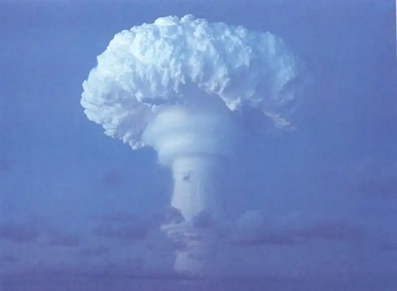 Один из самых мощных взрывов термоядерной водородной бомбы на счету США – операция “Castle Bravo”. Мощность заряда составила 10 мегатонн. Взрыв был произведен 1 марта 1954 года на атолле Бикини, Маршалловы Острова.