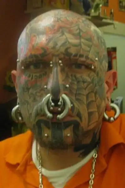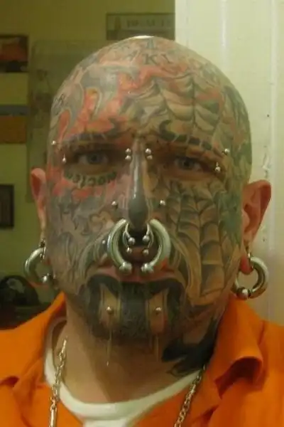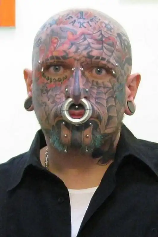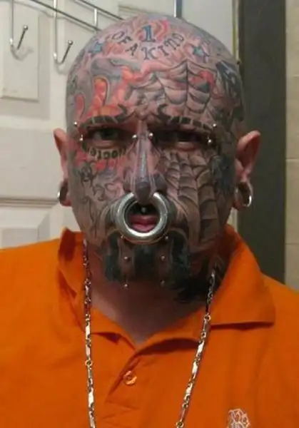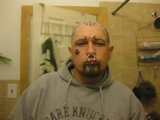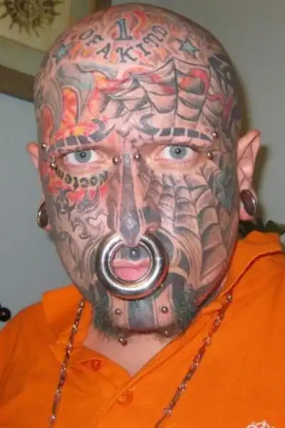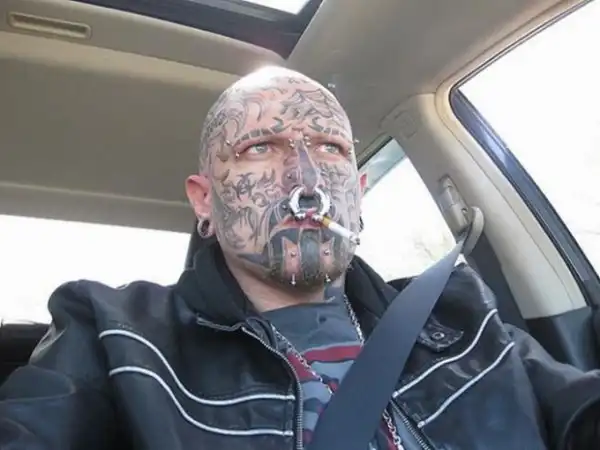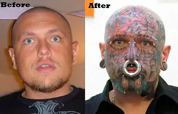 Господа, давайте отдадим ему должное: он и на первой фотографии был дебил дебилом. Тату и пирсинг лишь выгодно подчеркнули "богатство" его внутреннего мира.