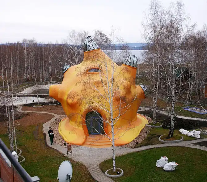 Екатеринбургский архитектор Юрий Гайдуков построил в поселке Таватуй в Свердловской области жилой дом в виде морской ракушки. Помимо необычной формы, здание удивляет и своим интерьером, в котором отсутствуют привычные прямые углы и линии. Свет в дом попадает через окна-выступы наверху ракушки и огромный витраж в стене.
