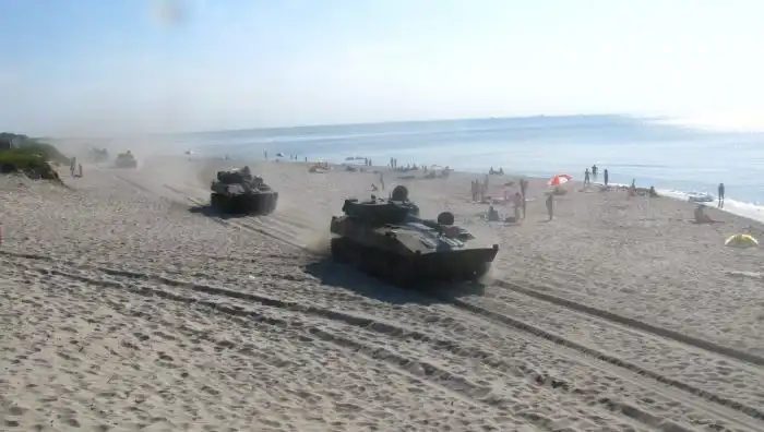 Город Балтийск, рядом морпеховская учебка, Сатурн, )) Сам бегал по этому пляжу в кирзе и форме, либо на полигон бегут он кстати в 18 км. либо с ))) А так да морпехи. После таких пробежек у отдыхающих пропадает вода которая в море охлаждается :)