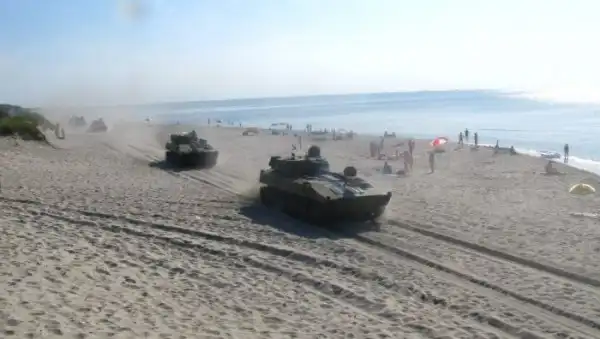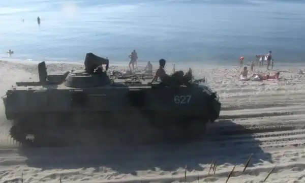 Ничего удивительного, взвод морпехов на САУ 2С1 и МТЛБУ купаться поехали.