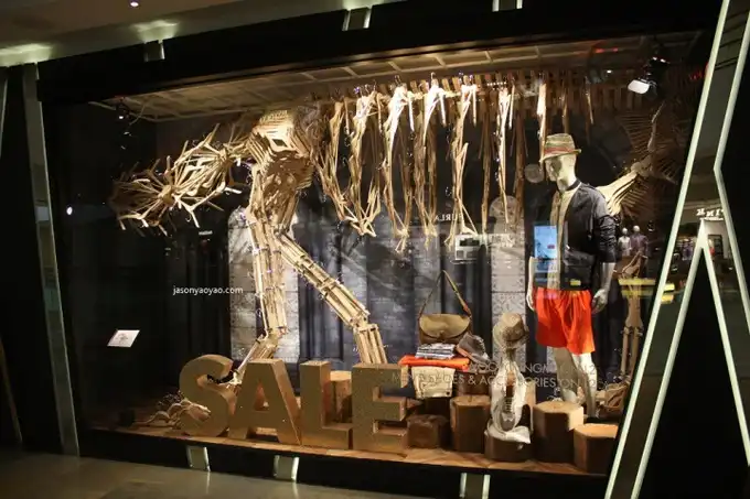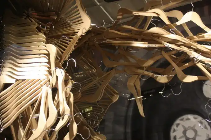 Универмаг Harvey Nichols в Гонконге демонстрирует в своих витринах необычную инсталляцию на тему Парка Юрского периода. Динозавры, построенные при помощи тремпелей, выставлены там на пару с моделями.
