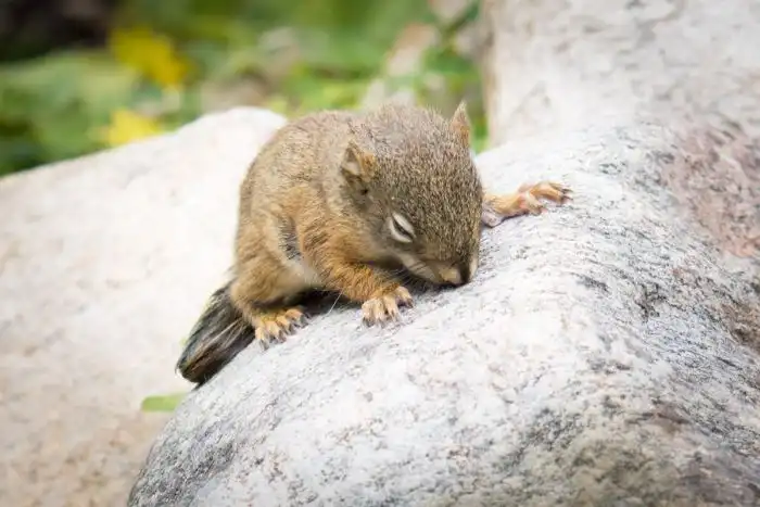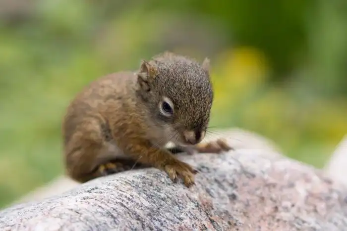 Крохотный бельченок провалился между камнями на берегу ручья,