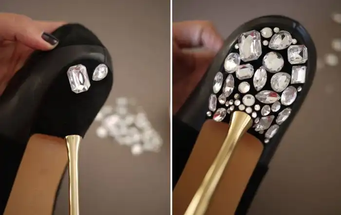Отличная инструкция о том, как украсить обычные женские туфли красивыми стразами.