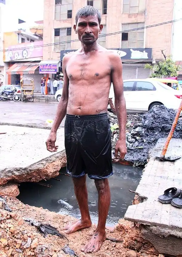 Этот 43-летний мужчина работает в Дели (Индия) канализационным дайвером.