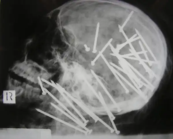 Гвоздь в человеческом черепе – пациент случайно выстрелил в себя из пневматического молотка. Он даже не понял, что выстрелил в себя – 10-сантиметровый гвоздь обнаружили только через 6 дней.