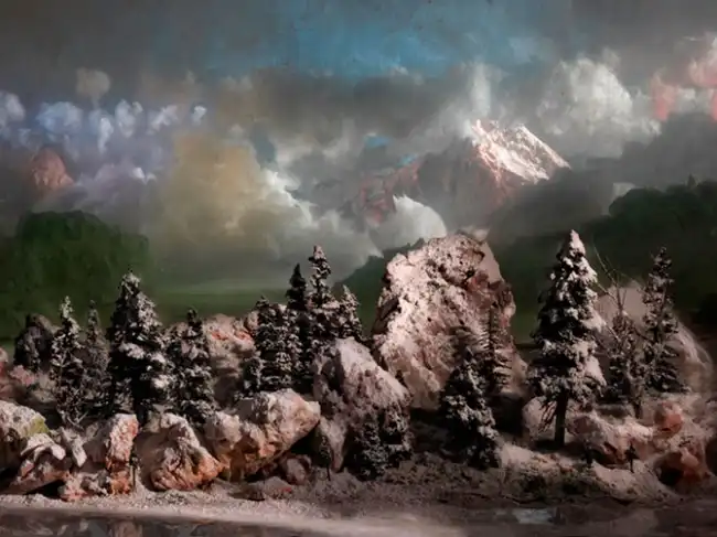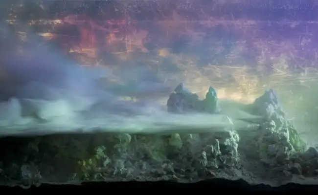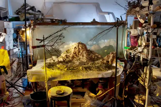 Художник создает удивительные по красоте и реалистичности пейзажи внутри 200-литрового аквариума, наполненного водой. Для этого он использует пластмассовые детали, разноцветную подсветку и нерастворимые пигменты.