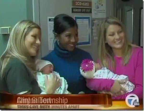 Сестры — близнецы, которые родили в один и тот же день, и в одной и той же больнице Сестры — близнецы и лучшие подруги могут добавить рождение детей в список событий, которые они разделили вместе. Эми Гильберт и Эллисон Оливерио по 25 лет. Рожали в соседних палатах. Младенцы появились на свет с разницей в 14 минут. Доктор Тимоти принимал роды у обеих сестер. Как он рассказал позже, это первый такой случай в его практике за 12 лет. Эми родила Клэр, а Эллисон Гарретта. Сестры вышли замуж за своих возлюбленных из школы с разницей в полгода. Говорят, что они не планировали одновременной беременности.