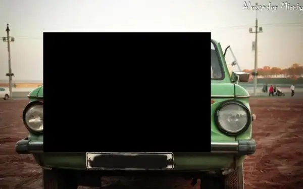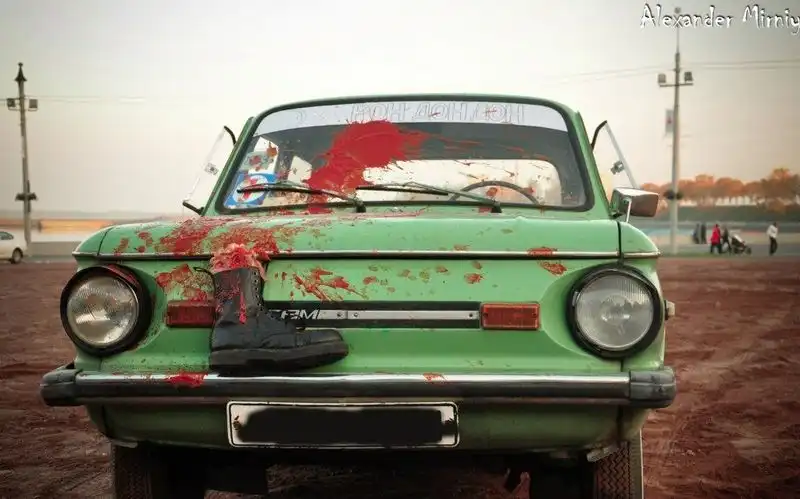 А может это запарожец людоед, водила встал на бампер из багажника вещи дастать, а тот и его и съел