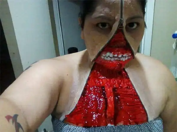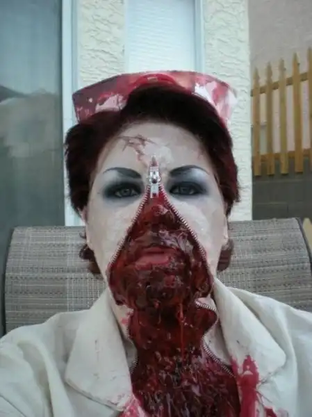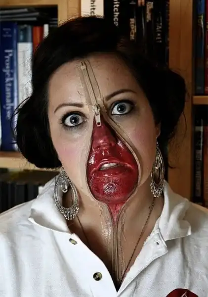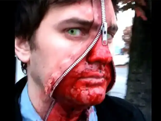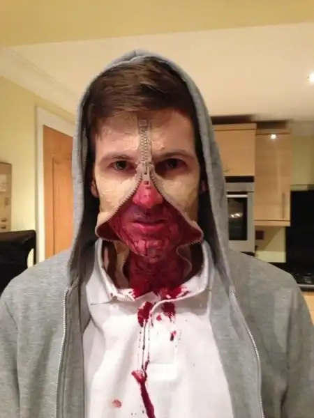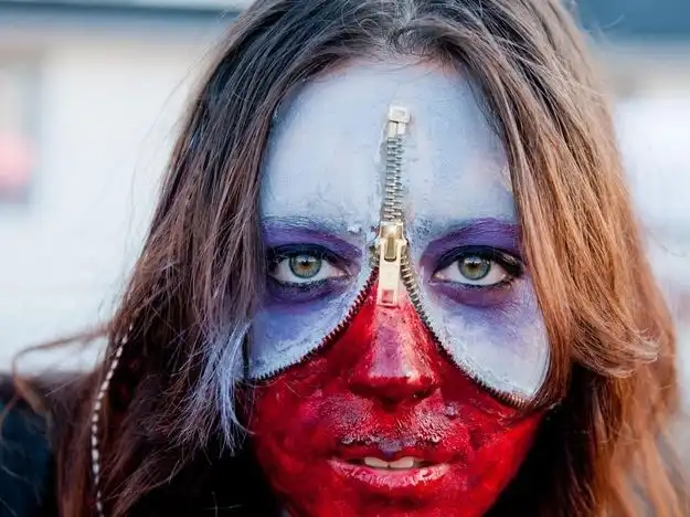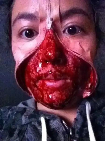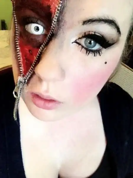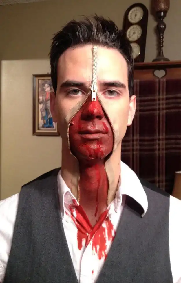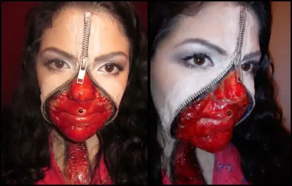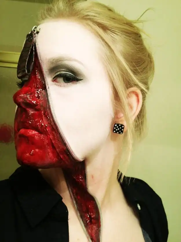Похоже, одним из самых популярных и мрачных стилей макияжа для Хэллоуина является плоть, якобы расстегивающаяся с помощью молнии. При обладаниями некоторыми навыками нанесения грима и наличии молнии от джинсов, к примеру, можно сделать из себя персонажа фильма ужасов, от которого на вечеринке все будут шарахаться.