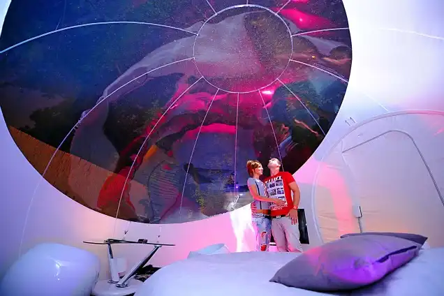 Концепцию пузыря придумал дизайнер Пьер Стефан Дюма. Такая продвинутая конструкция была создана с целью временного присоединения постояльцев к неизведанному. Ведь не многие могут себе позволить поспать под круглым потолком.