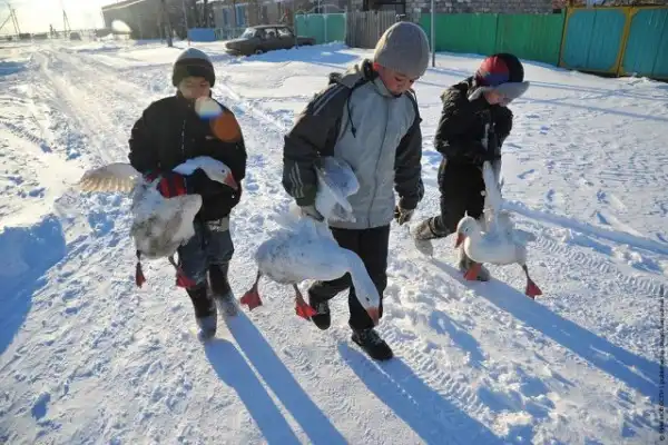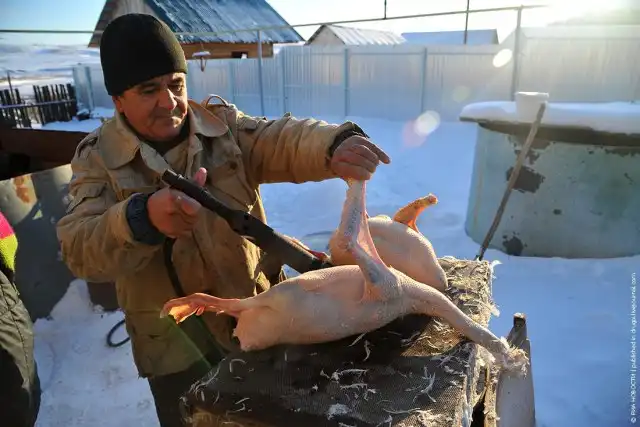 После наступления первых морозов в деревне Редутово Челябинской области происходит традиционный забой гусей. Жители рубят головы своим питомцам, ощипывают их и заготовливают мясо на зиму.