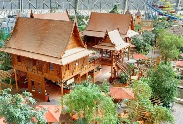 10. Вокруг бассейна можно увидеть красивую архитектуру Азии, например балийский Храмовые ворота, традиционный тайский дом, дом и Барнео и Ангнор-Ват.