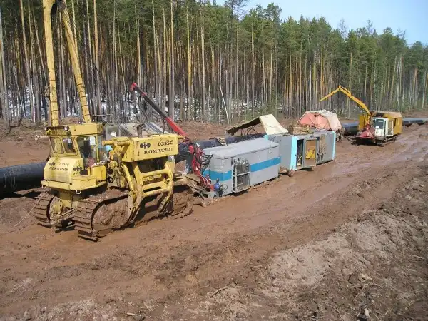 Судя по надписи на "Камазе" (пятый снизу) - это нефтяники строят или ремонтируют нефтепровод, но магистральные газопроводы из таких же труб собирают.