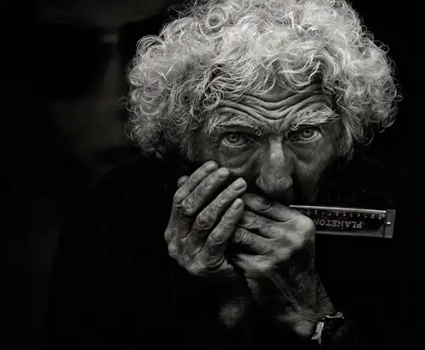 Человек с губной гармошкой. Портрет Майкла Нельдера (1936 г.), который развлекает прохожих на улицах Челтенхэма.